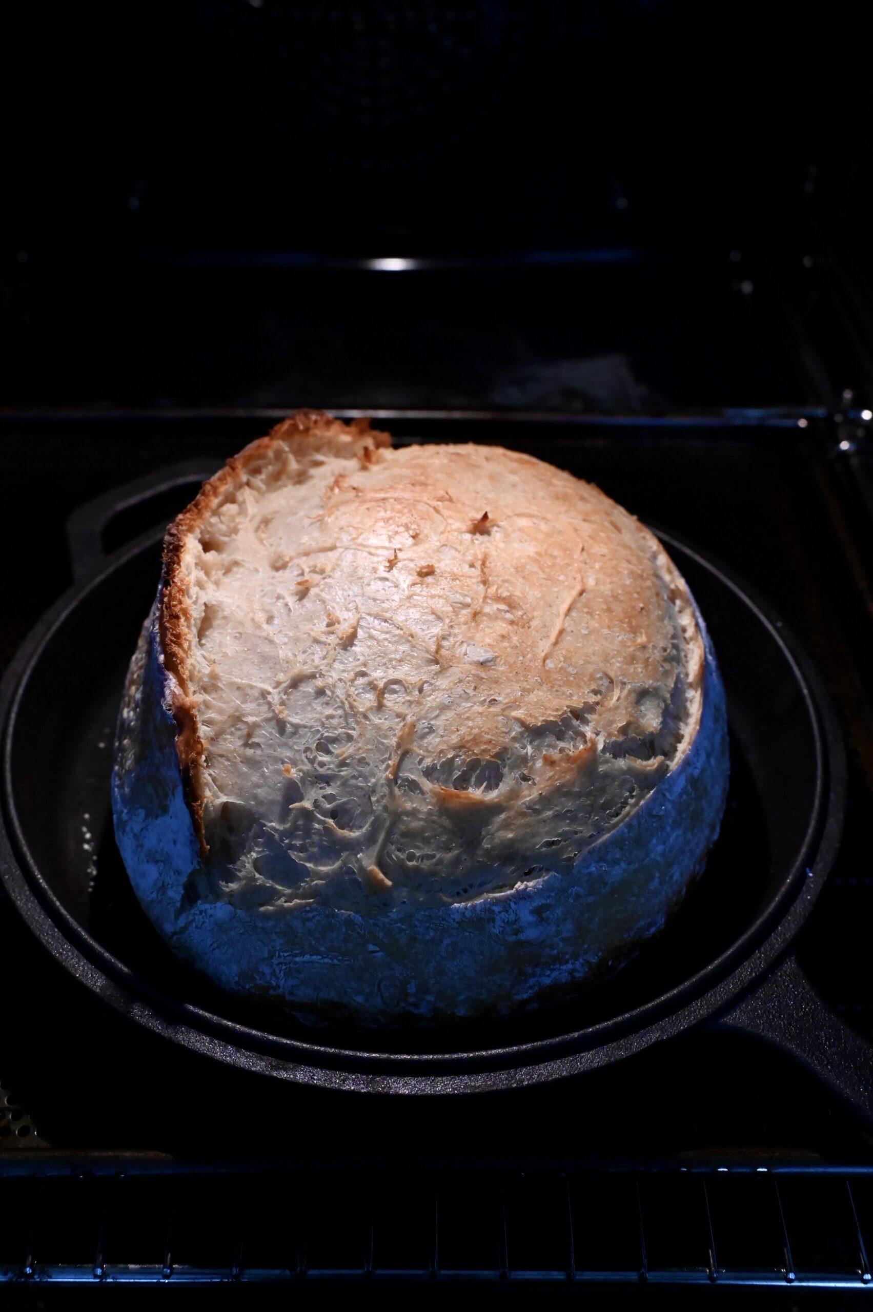 - Backen: Den Teig auf eine Backmatte oder ein Backpapier stürzen, mit etwas Mehl bestäuben, nach Wunsch einschneiden. Das Brot in einem vorgeheizten gusseisernen Topf bei 260°C mit geschlossenem Deckel für 20 Minuten backen. Danach den Deckel entfernen, die Temperatur auf 235°C senken und das Brot weitere 15–20 Minuten ausbacken, bis es eine goldbraune Kruste hat.